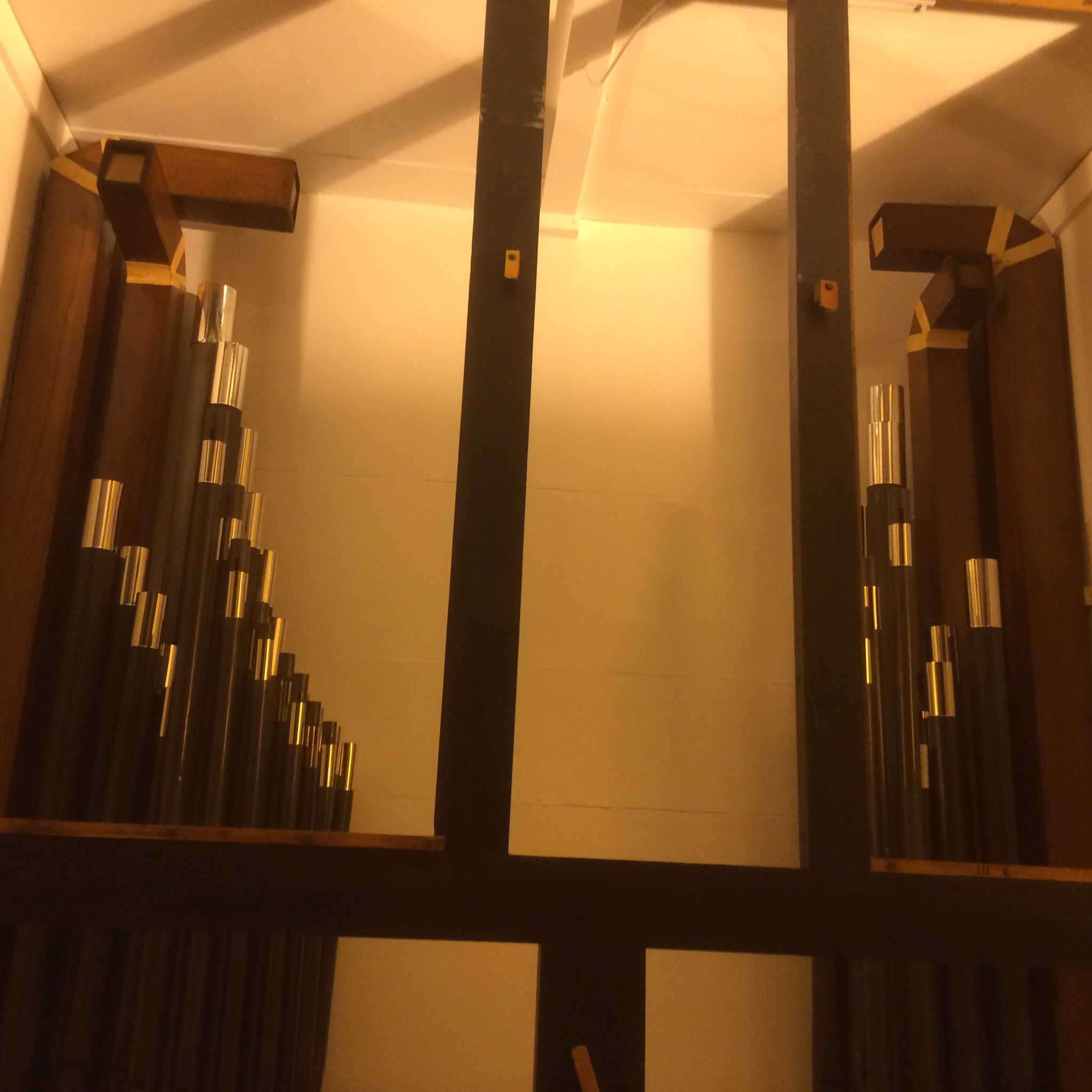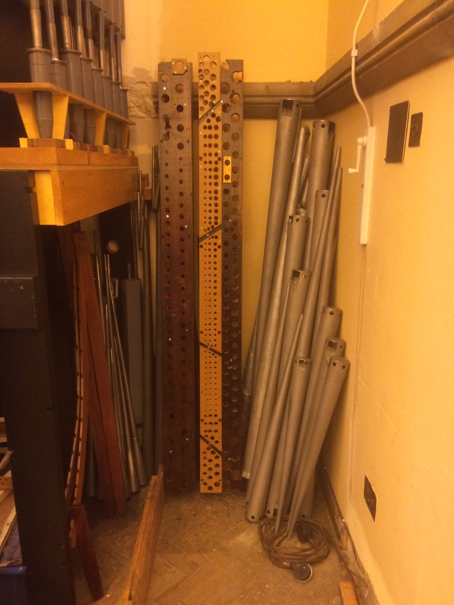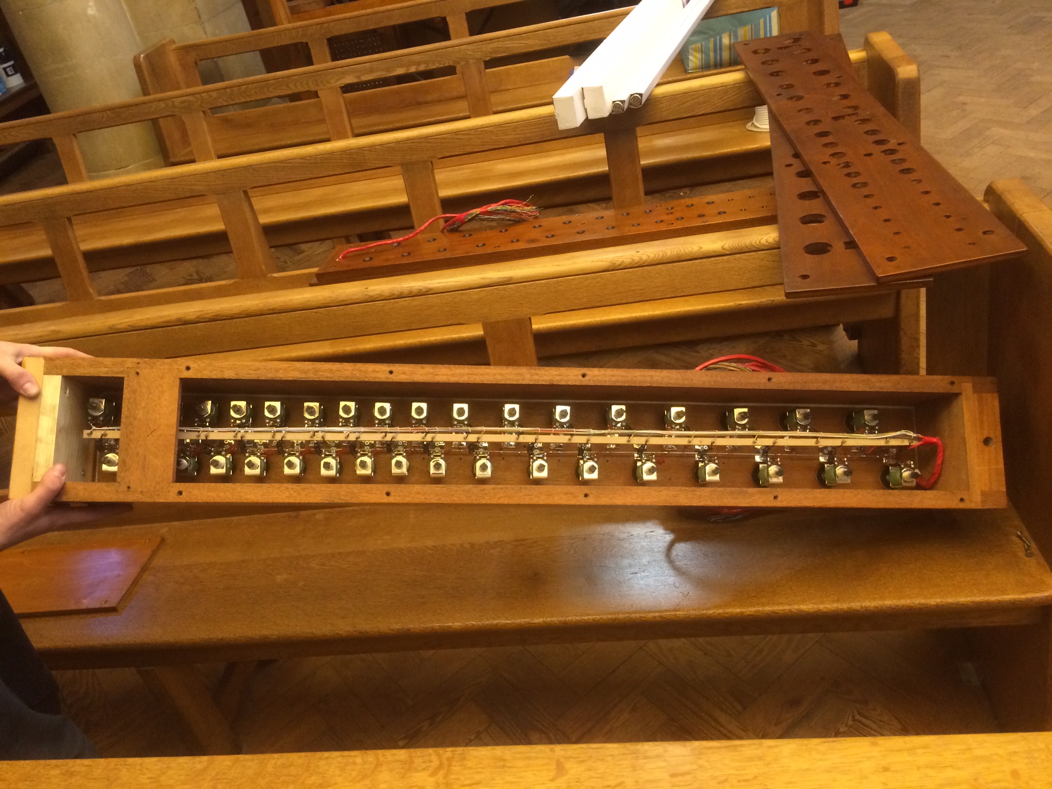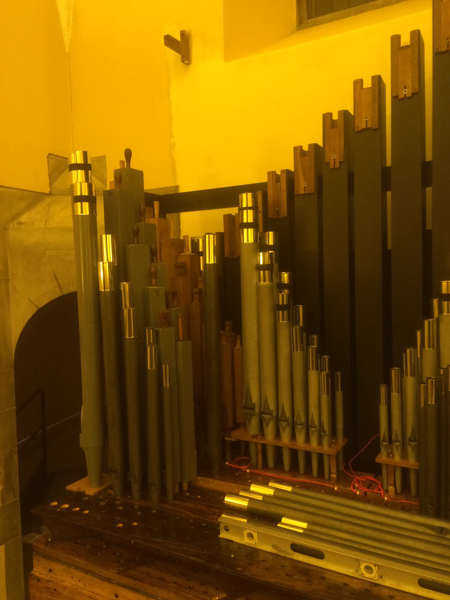 The Nelson ‘Closed Horn’ pipes have been refurbished and altered to become the new Swell Cornopean 8′ stop (a sort of bright, but soft trumpet) and have been brought to church. The old All Souls wooden flute pipes have also been refurbished and are back ready to be installed as part of the new pedal pipework.