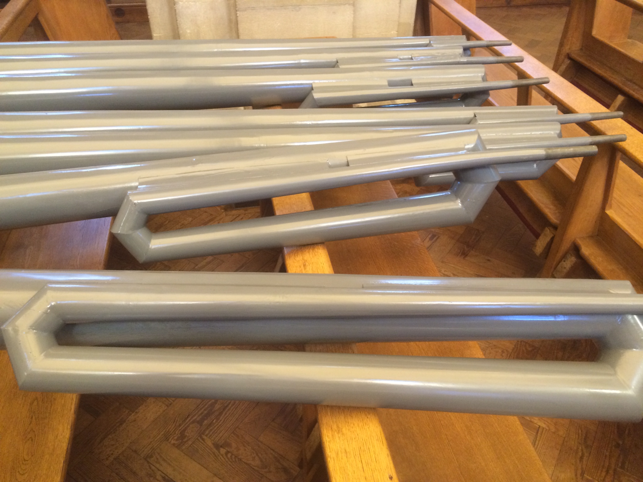 The four longest pipes of the Swell Violin Diapason 8′ Stop, at between 8′ and 9′ high, were too tall to fit in the refurbished All Souls swellbox (which we used because it was wider than the Nelson swellbox and fitted in the old organ case, which we are preserving), so, as part of their refurbishment, they have been ‘mitred’ (bent over at the top to fit in) in the M C Thompson workshop and yesterday they were fitted in the swellbox. In addition, the pedal principal pipes were completed and painted, the rest of the pedal bass pipes (for the soft 16′ Bourdon) were fitted into their new wind chest behind the swellbox, and the pipes of the Pedal 16′ Trombone were checked out for fit before they are refurbished.
