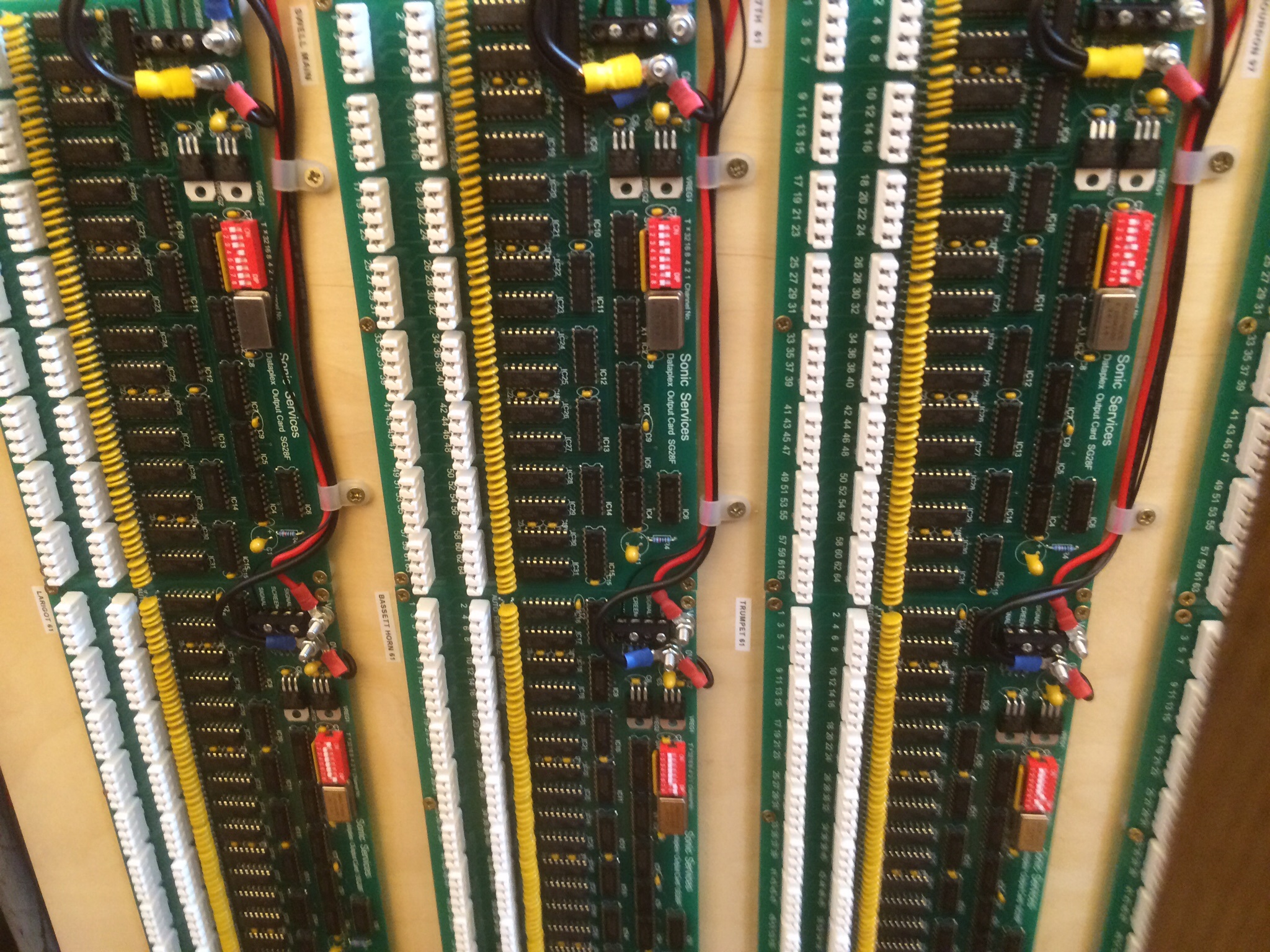 Massive progress this week (thanks to Mike and the team). We now have almost all the Great flue pipes in place, and all of the Swell pipe racks, together with both sets of bellows and much of the wind trunking. In addition, the solid state dataplex output cards for the registration systems and action control software (made for us by Sonic Systems of Thetford in Norfolk) have all been fixed in place adjacent to where the console will be fitted, together with all the wiring. Most of the refurbished casework has also been brought back to Church, ready to be fitted, and the second blower unit has arrived.